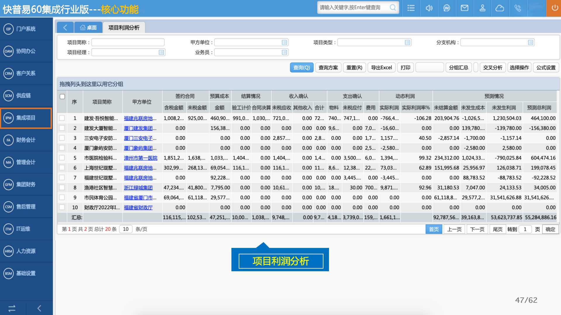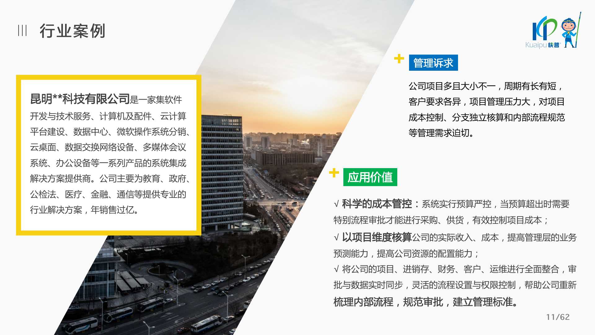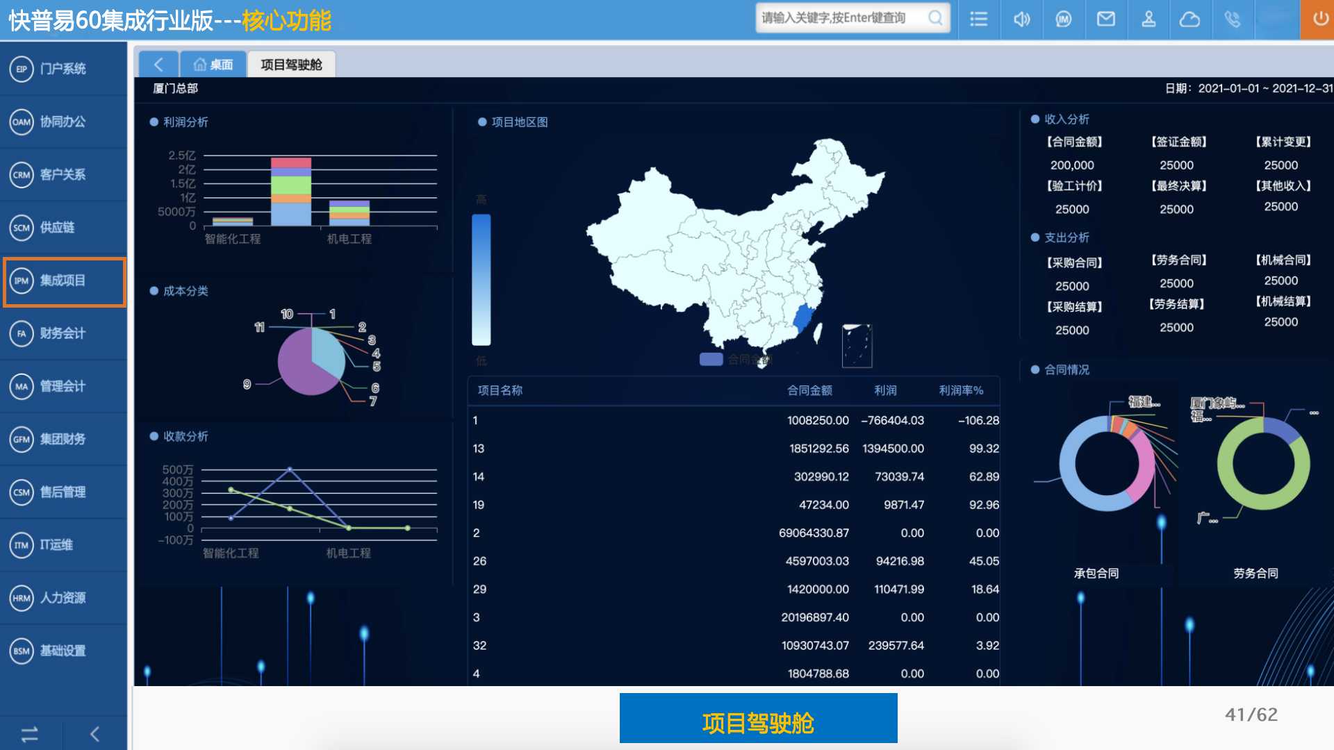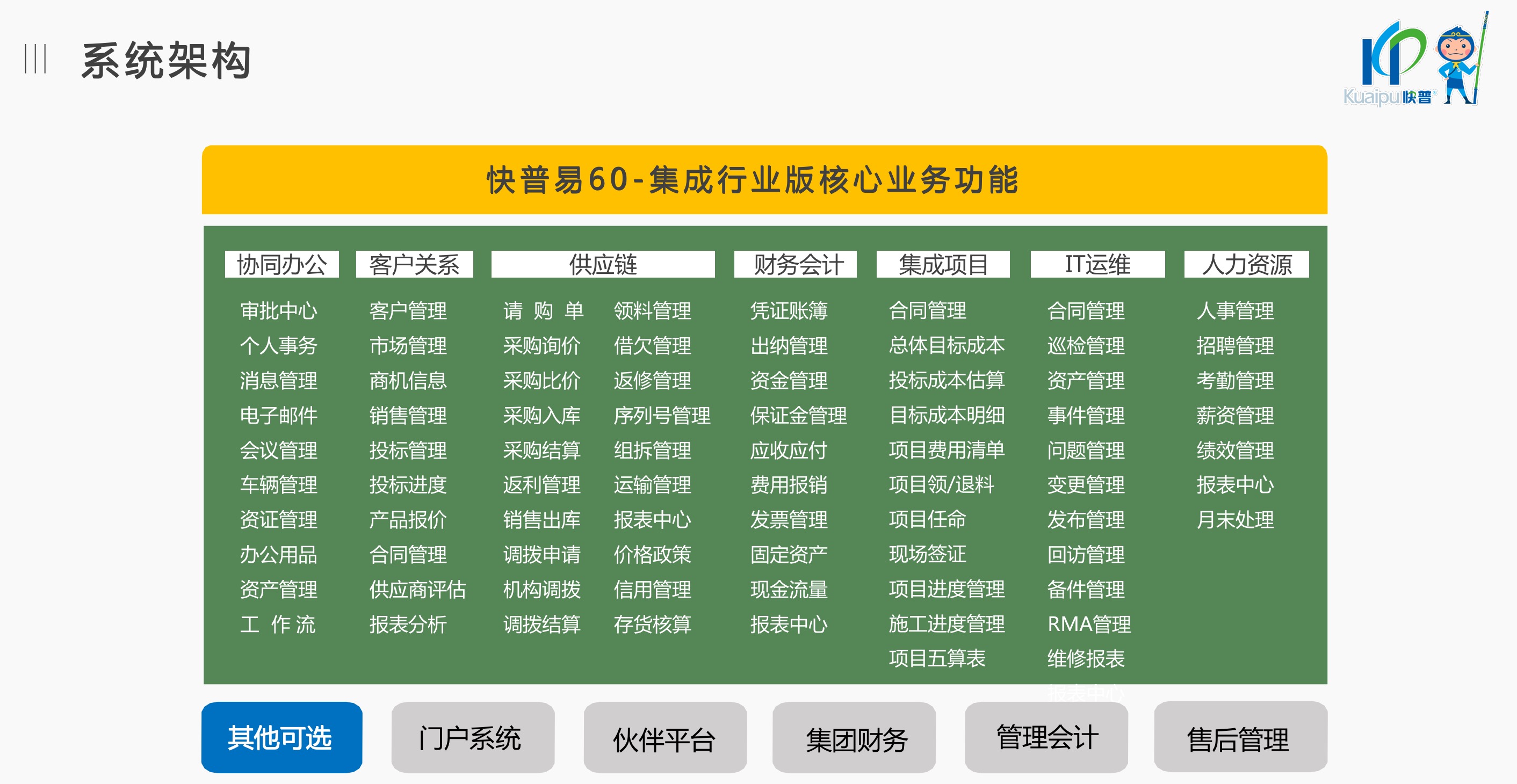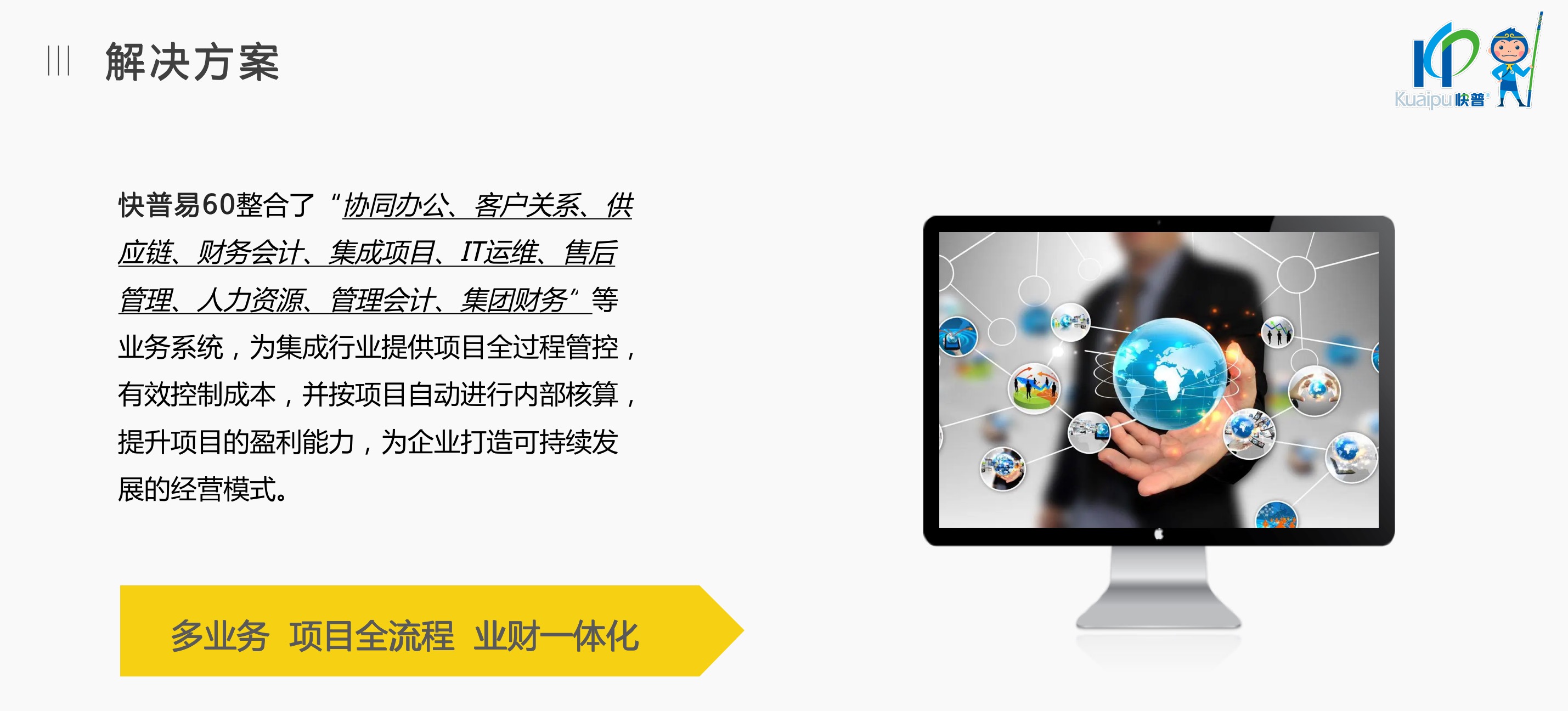 快普易60以客戶為目標、以項目為核心,為集成行業(yè)提供數字化管理解決方案,為組織和業(yè)務提效,實現(xiàn)項目全過程管控,有效控制成本,并按項目自動進行內部核算,提升項目的盈利能力,為企業(yè)打造可持續(xù)發(fā)展的經營模式。